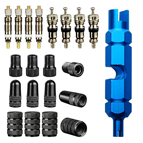 This package includes a handy valve core remover, 4 Presta valve cores, 4 Schrader valve cores, 4 bike valve adapters, 4 Presta valve caps, and 4 Schrader valve caps.