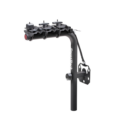 The sport rack sr2813bbspare tire locking bike rack allows you to take your bikes to those great outdoor trails safely without scratching your car or bike. compatible with all bike frames and sizes (bmx bikes, kids, women's, hybrids, road bikes and mountain bikes) and can accommodate oversized top tubes (2.5-inches or less). this rack can hold up to three bikes at once and attaches to spare tires or trailers for easy bike transport. the carrier features rotating clamps with rubber padding that holds the bike securely and includes locks to secure the bike to the rack and rack to the vehicle. this trunk mounted carrier measures 10-inches (l) by 2.5-inches (h) by 33-inches (w) and weighs 18-pounds.